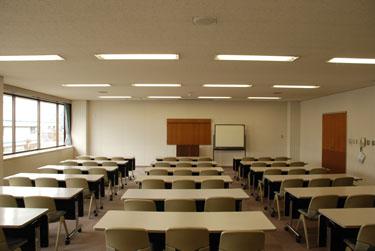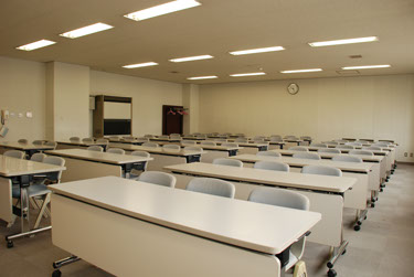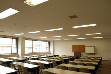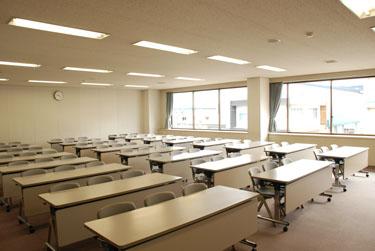 オフホワイトの色調に統一された、落ち着いた雰囲気の研修室です。最大72名程度を収容できる広さがありますので、ビジネススクール・会議・セミナー・歌会・展示会等、様々な用途でご利用が可能です。教壇や黒板も使用可能ですので、スクール的利用がマッチしそうです。